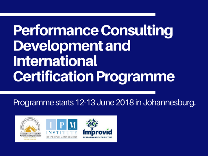 Belia Nel2025-05-29T18:22:06+00:00For more information about Improvid Performance Consulting visit our Human Performance Improvement website. We’re very proud to announce that IPM and Improvid have partnered to bring you a Performance Consulting Development and International Certification Programme that will commence on 12-13 June 2018 in Johannesburg (attending will earn you 8 CPD points). Here's what the programme will cover: To download the programme brochure as a PDF – click here. To learn more about this event please contact: Belia Nel at belia@nuro.co.za, or to reserve your seat please contact: Patricia Ramokgadi at patricia@ipm.co.za. If you would like to know more about what we do, please visit our website www.improvid.co.za or connect [...]